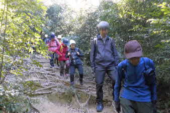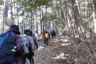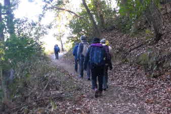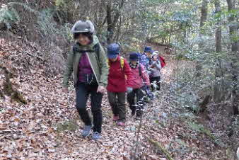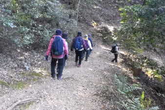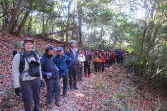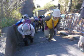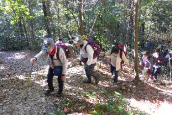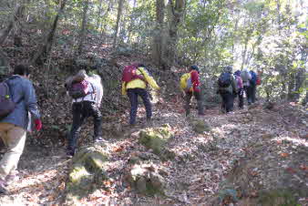 ほどなく、山への取っ付きに到着した。ここから山へと登っていく、山登り会の本番だ。京都一周トレイル東山コースの入口のようだ。急に山道の登りになったので面食らっている感じだ。