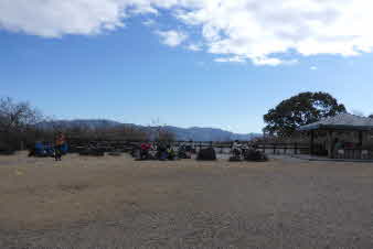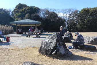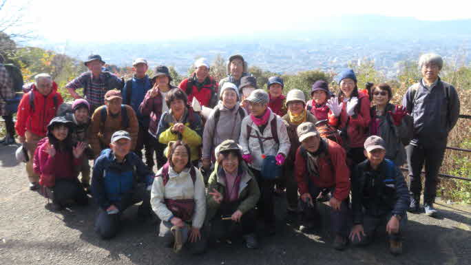 東山山頂公園に到着、標高220mぐらいで、東山ドライブウエイの開通で山頂公園のようになったと思われる。東屋や点在する岩で昼食にした。比叡山などの展望もできる。寒さ対策をしてきたが今日は良い天気で暖かい。