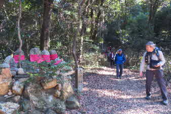 展望を楽しんで、山頂をあとに、円山公園を目指して下り始めた。10分ほど下ると、辻に赤いよだれかけをしたお地蔵さんが祀られていてみんな立ち止まって、手を合わせていたようだ。