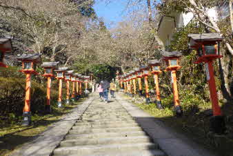 通りに出ると直ぐ、赤い鳥居が見えてくる。貴船神社の鳥居だ。ここから石段が続いていて、両脇に朱色の燈籠が並んでいる。