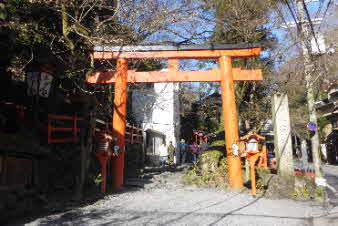 こんなに登ったのかと思われるほど下りが続き、やっと西門まで下ってきた。ここで鞍馬山とはお別れだ。朱の橋を渡ると広い通りに出る。
