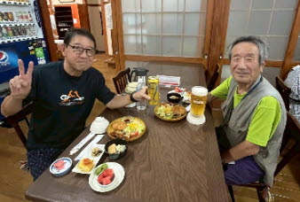 第1日目8月17日は移動日で大阪を8時に出発、高山経由で上高地に入った。上高地には3時半到着とかなり長い旅だった。梓川から穂高の山などを眺めるが残念ながら雲の中だ。ぶらり歩きを諦めて、西糸屋山荘へ入り、お風呂につかり、ビールで乾杯、ゆっくり寛いだ。 |