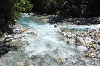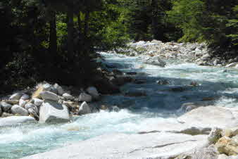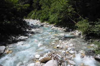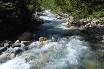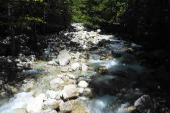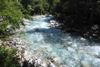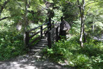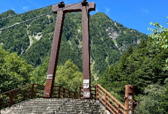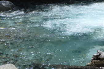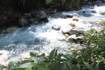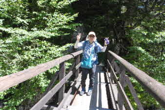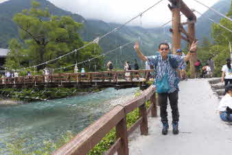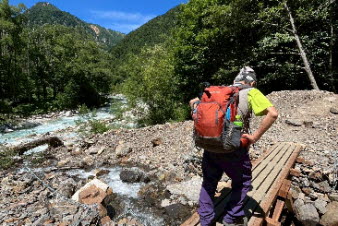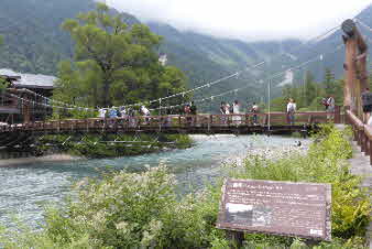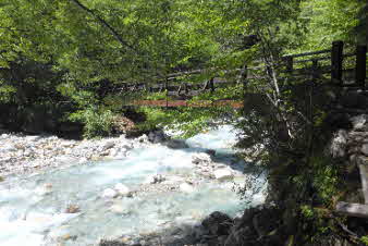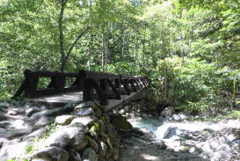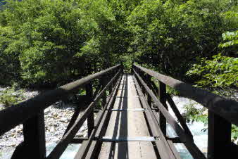 梓川の清流に感動しながら槍沢ロッジへと登っていく。大都市では見られない素晴らしい川の流れだ。川を見ているだけで心が洗われる感じだ。やがて、二ノ俣に掛かる橋を渡っていく。 |