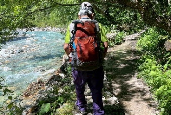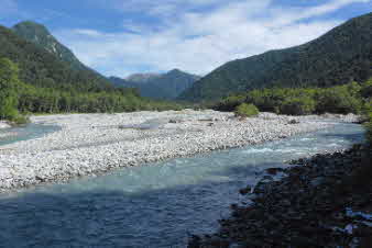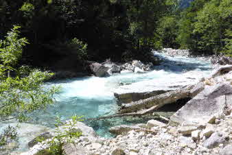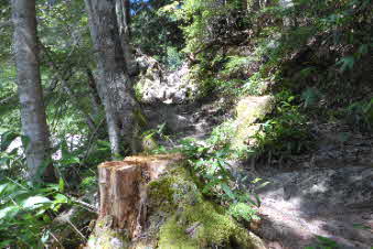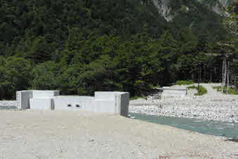 ここから遊歩道も登山道に近くなってくる。梓川は清流で有名だが、河川工事が年中行われているようで、ガランガランと工事の音が各所で聞かれる。徳沢から少し進むと、新村橋があるが、流出したのか新しい橋の工事が進んでいる。涸沢からパノラマコースで、ここ新村橋によく下ってきたものだ。 |