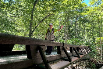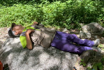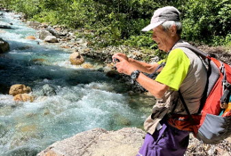 横尾から約1時間、一ノ俣まで登ってきた。一ノ俣にはかなり大きな橋がかかっているが、沢の流れはかなり力強さが感じられる。大自然が生きているようだ。橋を渡って広場の岩でゆっくりくつろいだ。自然はとても素晴らしい。 |