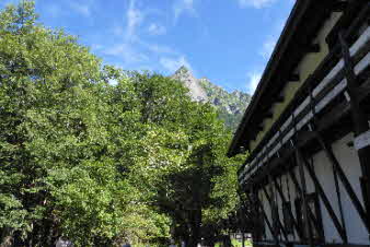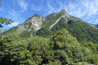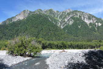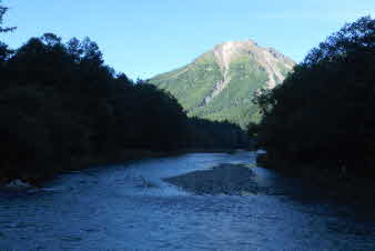 明神館から少し先へ行くと小さな沢があり、橋がかかっている。ここから見る明神岳の雄姿は本当に素晴らしい。ここの小さな沢の上流が、上高地を開いた原点となる徳本峠だ。 |