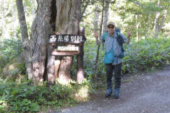 歩き始めると、すぐに分岐があり、蝶ヶ岳への分岐だ。今年5月残雪の蝶ヶ岳に登った思い出が蘇ってくる。横尾から目の前に聳えていた、屏風岩も涸沢からパノラマコースを経て登ったのも、良い思い出だ。 |