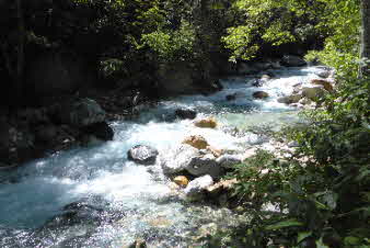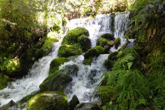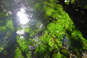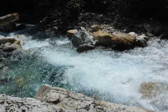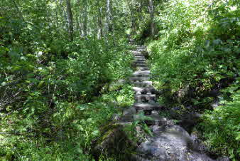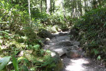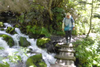 横尾から30分ほど進むと、梓川の滝の音がしてくる.。背丈の数倍の滝だが涼風が体を休めてくれてとても素晴らしい。ほっとしてまた歩き始める。 |
