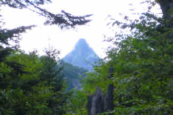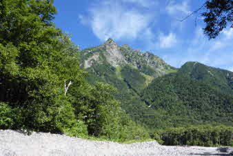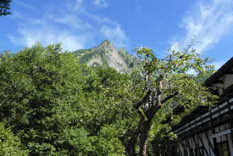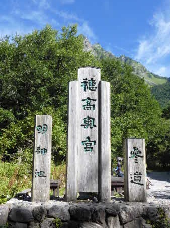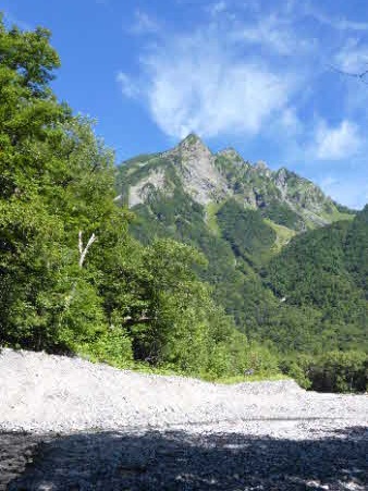 河童橋をあとに、素晴らしい山頂を目指して、わくわくしながら歩き始める。約40分で明神に到着、明神岳の尖った姿が美しい。その昔、明神岳を穂高岳と称していた。今日は行けなかったが、山裾には穂高神社奥宮がお祀りしてある。 |