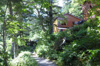 梓川の清流と力強さを全身で感じながら登って行くと、最後の登りになり、見上げると槍沢ロッジに到着だ。