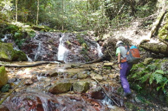 第二堰堤から斜面を巻いて進むが、また踏み跡が見つからなくなり道迷い。藪漕ぎの末、30分遅れで第三堰堤の上を通過し、やっと滝が見えてきて、F1滝に到着する。 |