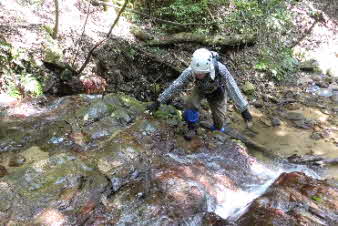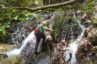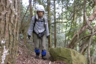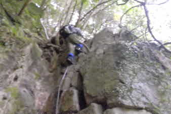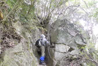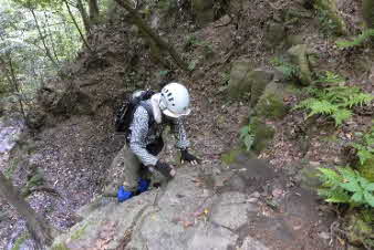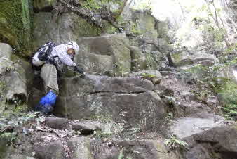 F3滝の右岸の岩場を登る。滝から見える所かだろうか、ロープやクサリはない。熟練者向きのコースになってきた。 |