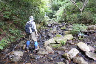 西山谷入口ゲートから少し歩くと、石ころだらけの河原に出る。その先に堰堤がある。堰堤の左岸を高巻きして上がる。途中で天狗岩への道と間違えて引き返し15分の遅れで第二堰堤の上部に出る。 |