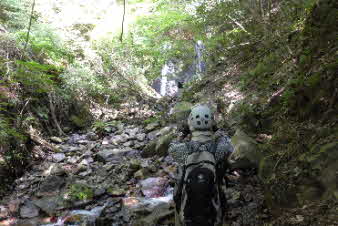 いろいろ試行錯誤し、やっと見覚えのあるF15そうめん滝が見えてきた。とりあえず一安心だ。滝の右岸の崩れかけた崖を登り、先へと進んだ。 |