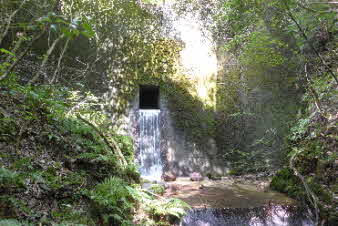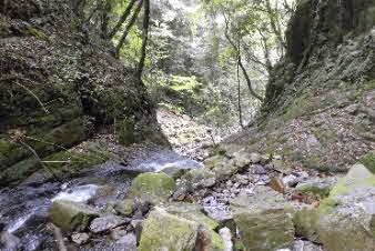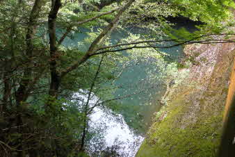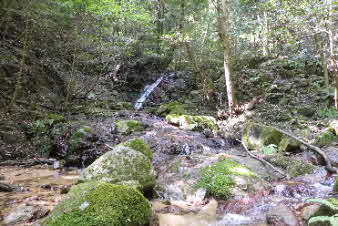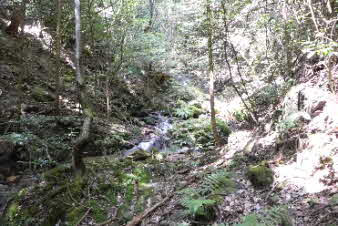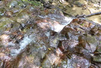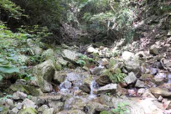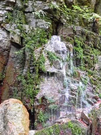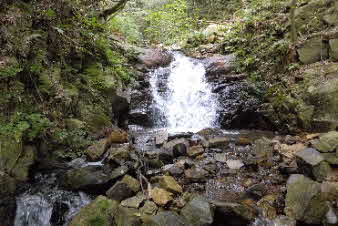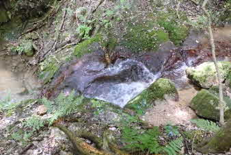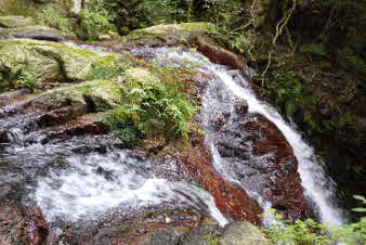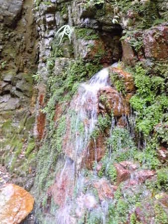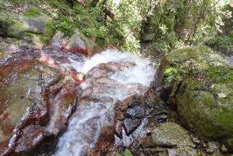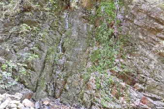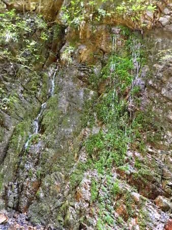 登り切ると、右岸の岩壁に、お盆ほどの穴が開いていて、水が噴き出している。吹き出た水の先は緑の苔でとても素晴らしい。 |