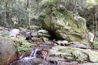 F3滝の滝頭の上がると、岩や苔、清い水の流れがとても美しい。少し進むと右岸の崖に美しい光景が見られた。岩肌に緑の苔があり、白い水が滴り落ちている。とても素晴らしい自然だ。 |