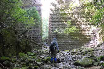 第五堰堤が見えてくる。第五堰堤の右岸の岩場を登る。クサリが下がっているが足場がなく、かなり苦戦だ。なんとか登り切ったが、もし引き返すとなったときに、この岩場を下れるかが大いに心配だ。 |