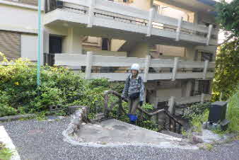 そうめん滝から迷走すること1時間、やっと、頭上に建物が見えてきた。これでやっと助かったようだ。六甲天狗岩ヴイラの裏側になんとか到着した。 |