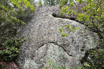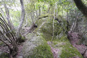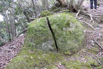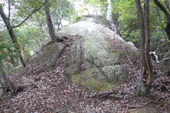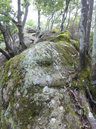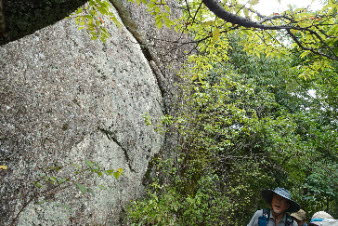 マンモスの背を下り終えると、でっかいお正月の鏡餅をさらに巨大にした岩、大黒岩を越えて下る。これで明神山の見どころは終わり、登山口へと下っていく。 |
