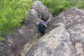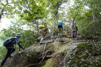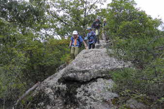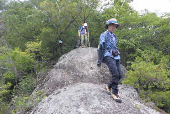 ここから東北に延びる尾根になり、最後の楽しみが待っている。まず、達磨岩でロープを使ってクライミングの真似をしながら降下する。 |