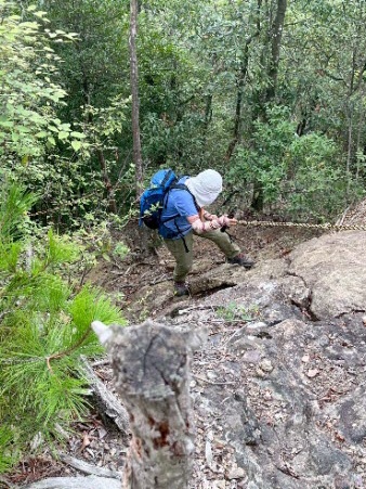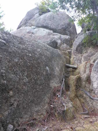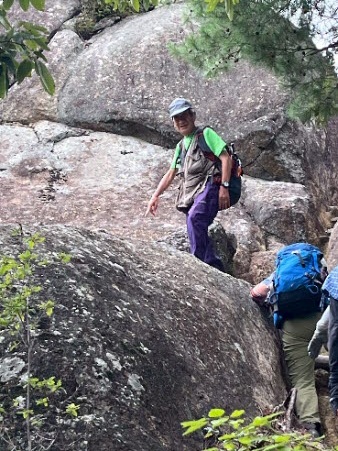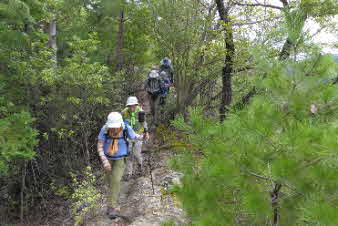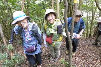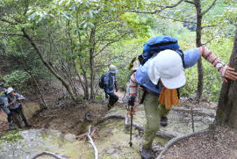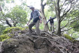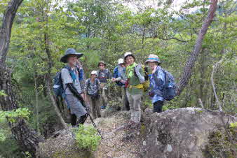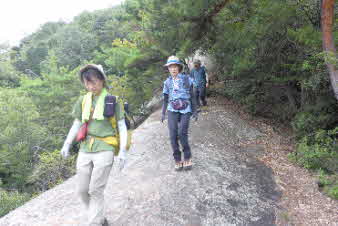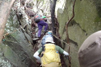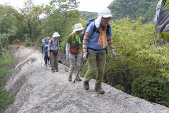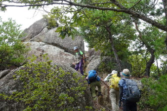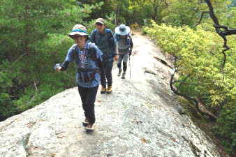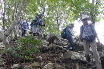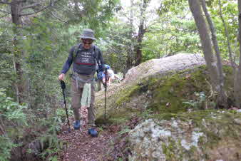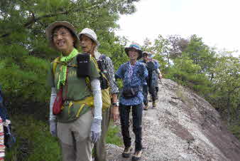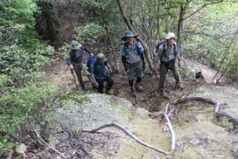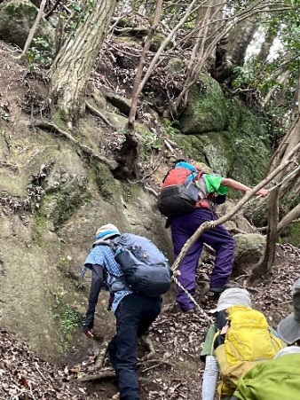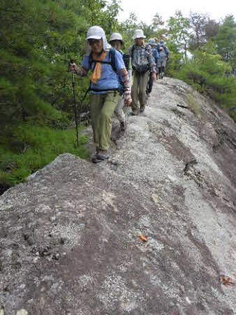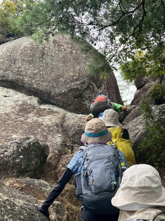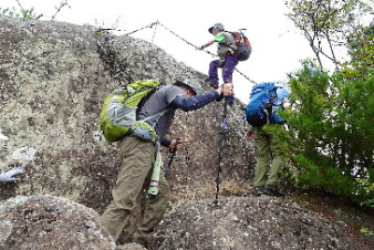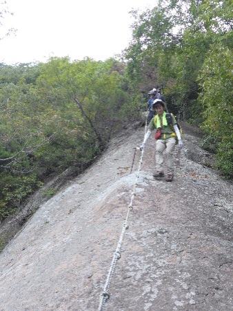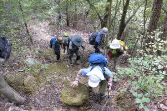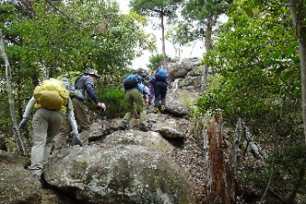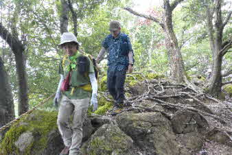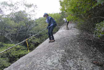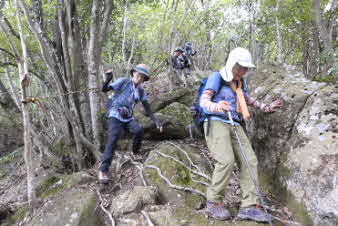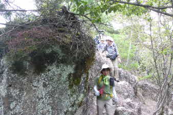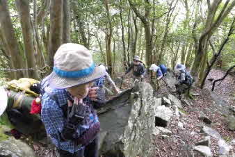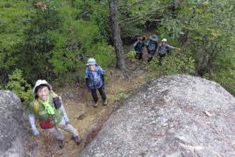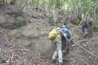 昼食を頂いて先へと進んでいく。御邪魔岩、夢眠岩(ムーミン岩)など楽しみも多い。楽しみもつかの間、きつい坂が待ち受けていた。がまん坂でロープなどの助けを借りながら登り切る。がまん我慢! |