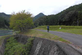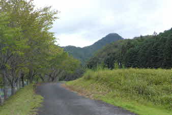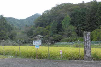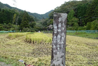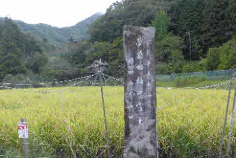 正面にこれから登る明神山が見えている。実りを迎えた田圃は美しい。その前に登山口の標識が建っている。文字が消えかかっていて読みづらいが、「大阪五十山 夢前の播磨富士 明神山登山口」と記されているようだ。 |