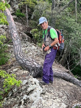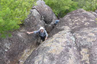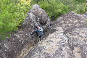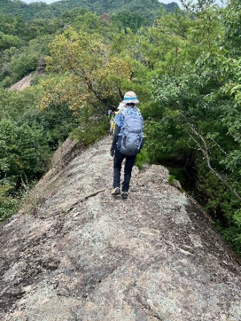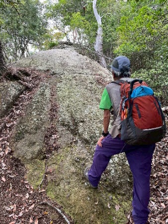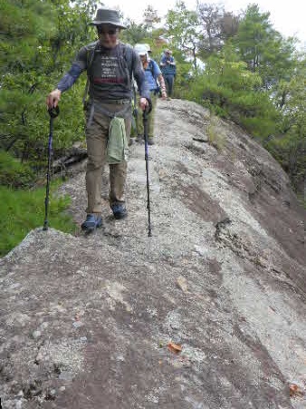 観音岩は、今日初めてのわくわくする大きな岩だ。みんな楽しみながら岩に登った。登り切ると、先へ続く細長い岩の尾根になり、なかなかここも面白い。 |