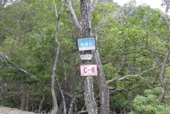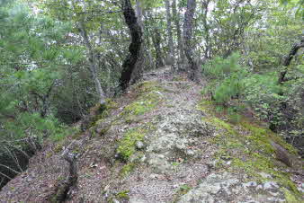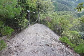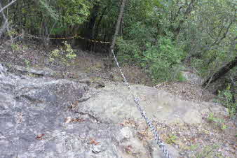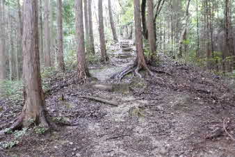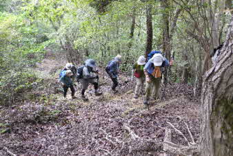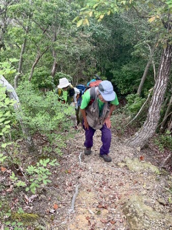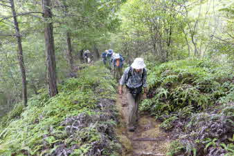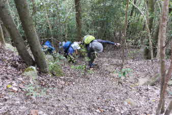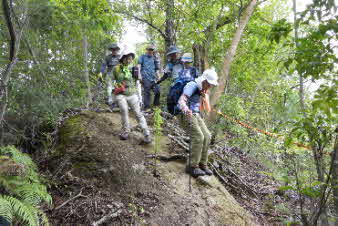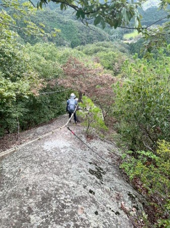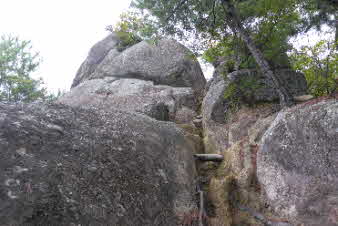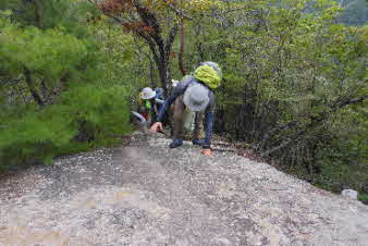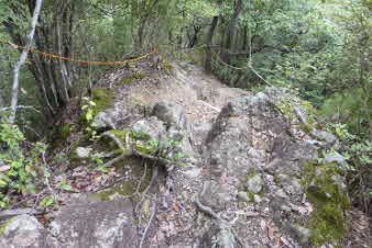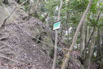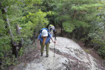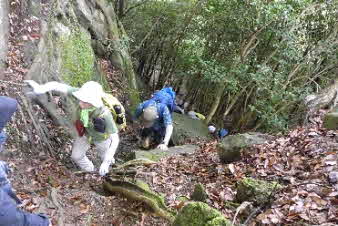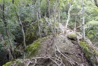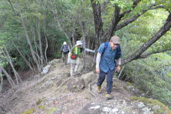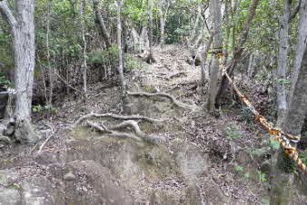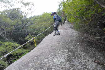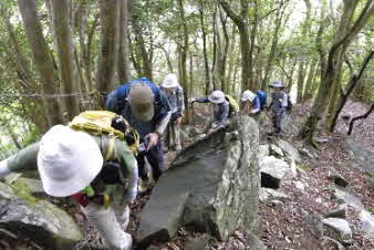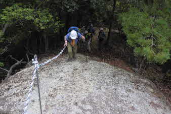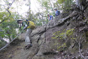 明神山も例外ではなく、最後に厳しい試練が待っていた。八丁坂と呼ばれかなり厳しい坂だ。ロープの助けを借りながら、四つん這いになって登っていく。 |