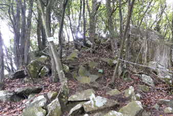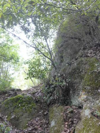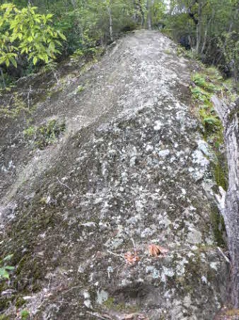 尾根筋に出て数分進むと、急登になってくる。尾根道の右に大きな岩の壁聳えている。屏風岩で周囲を巻いて進む。 |