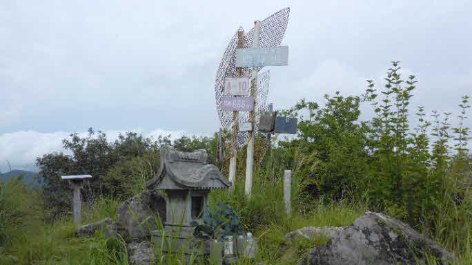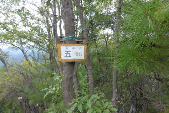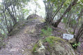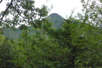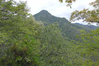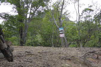 がまん坂を登り切ると、地蔵岳の山頂に到着する。地蔵岳は、標高511mの山だ。山頂は木々に覆われていて、木々の隙間から明神山をなんとか見られる。 |