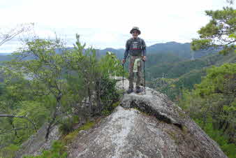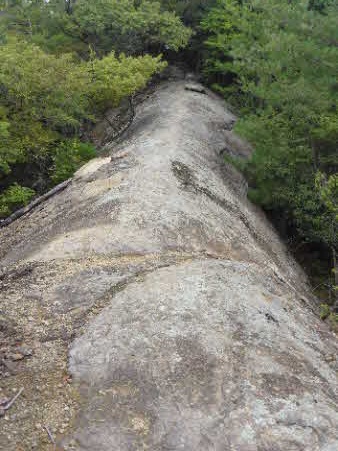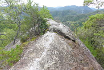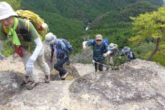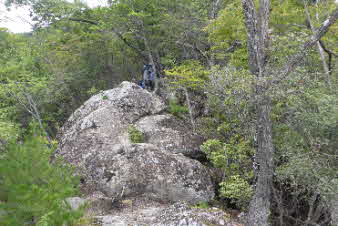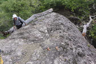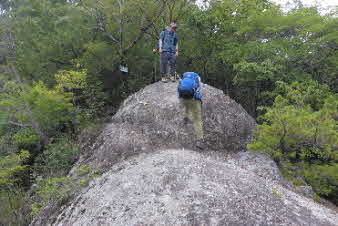 尾根をどんどん登っていくと、やがえ合掌岩に近づいてくる。多いな岩にはロープが付けられているので、時々ロープの助けを借りながら岩をよじ登っていく。大きな鏡餅のような岩に登り切ると、結構スリルがある。 |