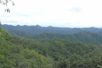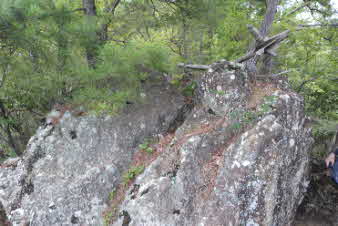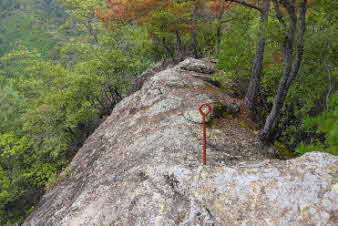 屏風岩は余り近すぎて岩の実感が湧かない。屏風岩の上部に登る道があり、登ってみた。上部は岩ではなく普通の山頂のような感じだ。先端から下を覗くと、やはり吸い込まれそうだ。木々の間からこれから登る、明神山の山頂が見える。 |