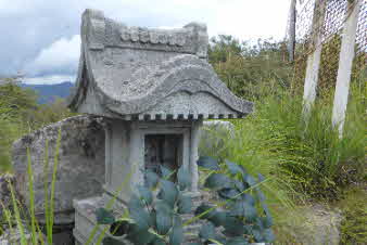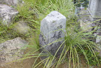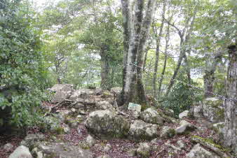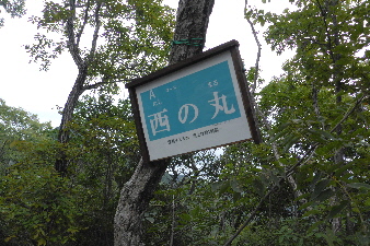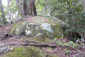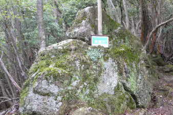 さらに下ると、一刀石と呼ばれる苔むした石が道脇にあった。さらに進むと西の丸になる。そして五合目になり、振り返ると明神山が見送ってくれる。 |