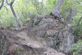 コースに戻り、先へと進む。少し下って登り返していく。正面に大きな岩、観音岩が立ちはだかっている。お餅を積み重ねたような岩で、中央で縦に割れたような感じで、階段がつけられている。 |