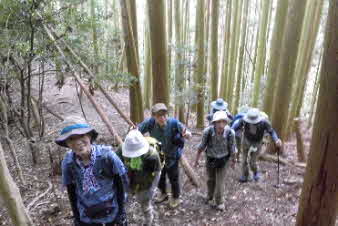 山頂からの下りは、気合坂と呼ばれ登りは、気合を入れないと登れないくらいの急斜面だ。ということは、下りも厳しく、一歩一歩ゆっくり下った。 |