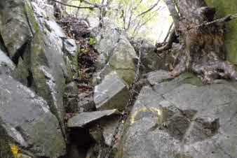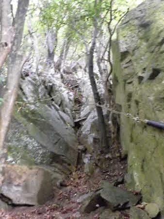 少し上がると切り立った岩の割れ目、鎖場を登っていく。低山ながら大きな岩の壁にアタック。なかなか面白い。登り切るとゴロゴロとした小さな岩の斜面を登る。山頂が見えてきた頑張ろう。 |