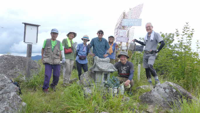 明神山に全員登頂。明神山は標高668mで、三等三角点になっている。山頂には、山頂標識、嶽大明神祠がある。山頂からの展望は名種山、名種槍、名種薬師など周囲の山々が、瀬戸内の海も臨める。今回は少し曇っていたので、ソフトな眺望だ。 |