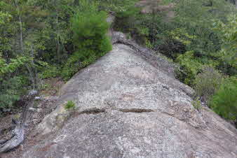 くじら岩に到着、細長い尾根が、くじらの背のようなのでこの名がつけられたのだろう。背を踏み外すと、海底、いや谷底に落ちてしまう感じだ。でも結構楽しい岩の尾根だ。 |
