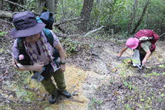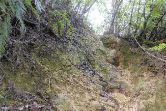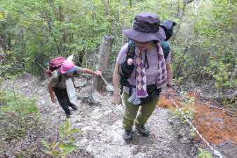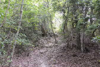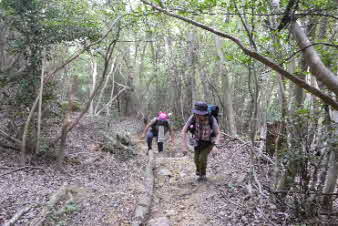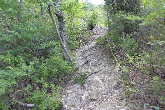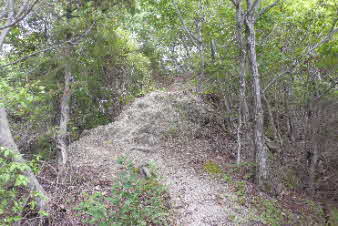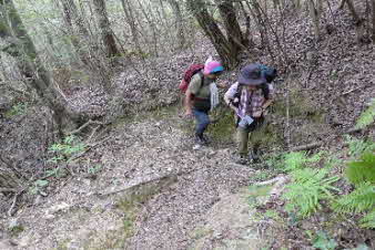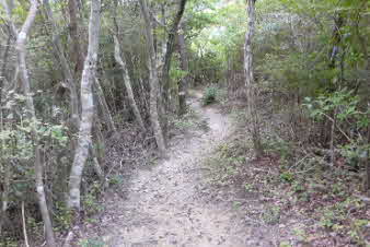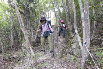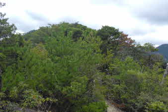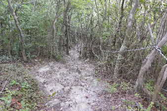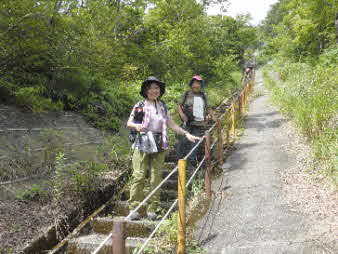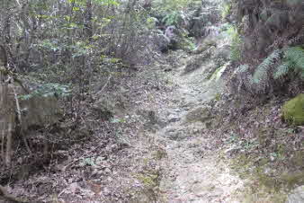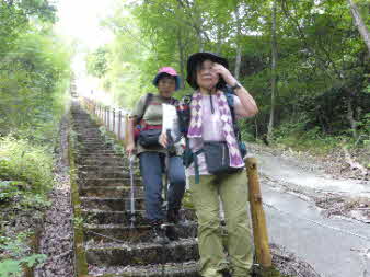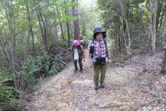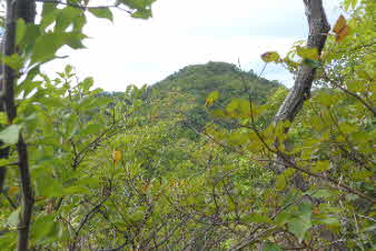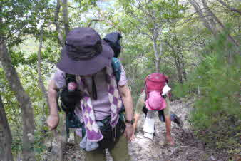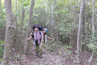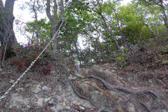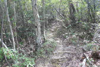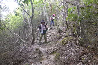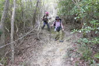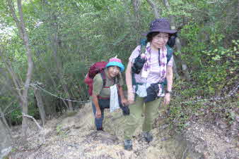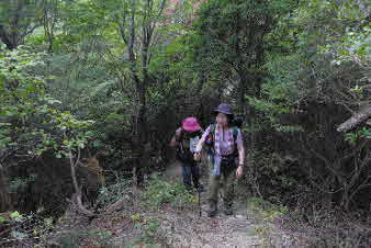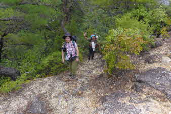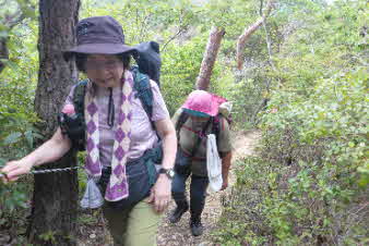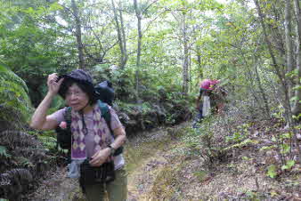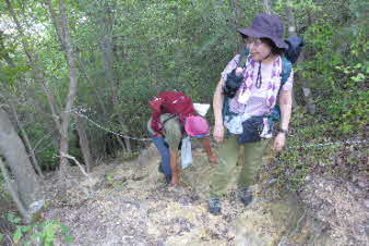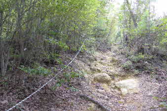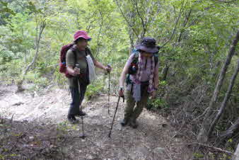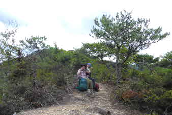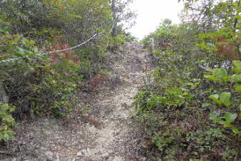 約30分急な、ほぼV字になった道を登り詰めると、尾根に出る。暑さで熱中症の心配をしていたが時々、心地よい風が吹いてきて癒してくれる。 |