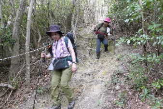 高丸山へ登山開始、少し進むと、砂防ダムへの立ち入り禁止の看板がある。ここからいきなり急な登りが始まる。所々にロープが張ってあって、時々利用して登っていく。