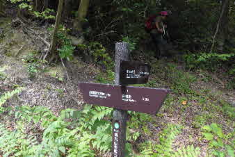 山頂をあとに下り始めると、ポツポツ雨が降り始めた。雨具をつけるか様子見をしながら下った。急な下り道になったが雨はどこかへ行ってしまった。 |