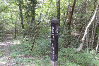 下り終えると、小さな沢に出て下っていく。道標があり、左方向は通行止めの行き止まりになっている。以前はここを進み、神鉄の線路を渡ったそうだが、今は通行禁止になっている。