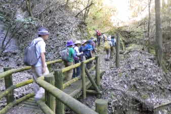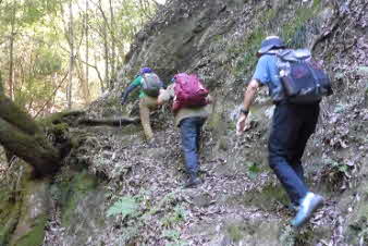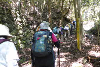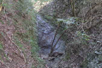 少し坂を登ると、石垣と民家の間に槇尾山の登山口がある。登山口を入ると、いきなりの急登が始まりしばらく続く。10分ほどで尾根筋に近い道になり、少し下ると、小さな滝に出る。滝は残念ながら干上がっていて岩が露出していた。 |