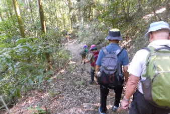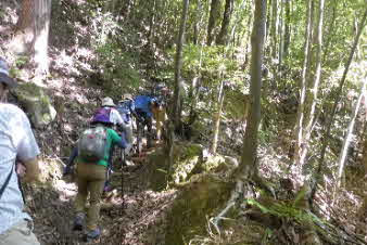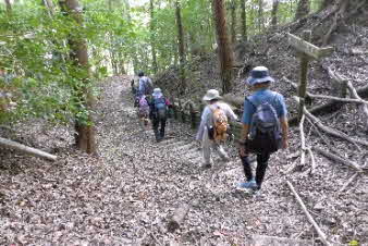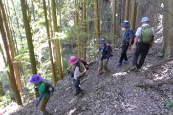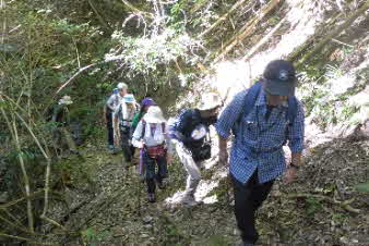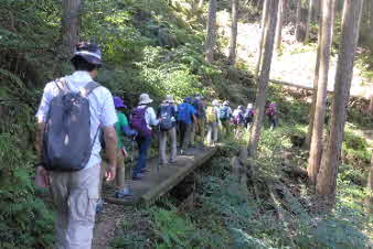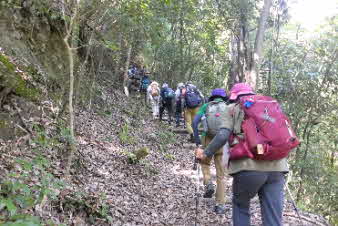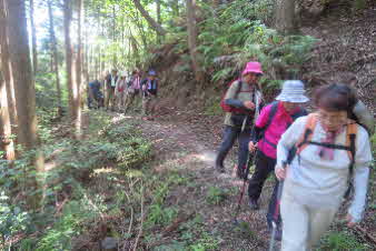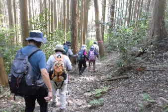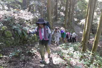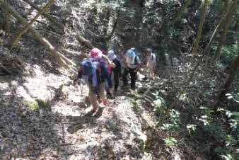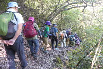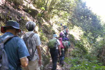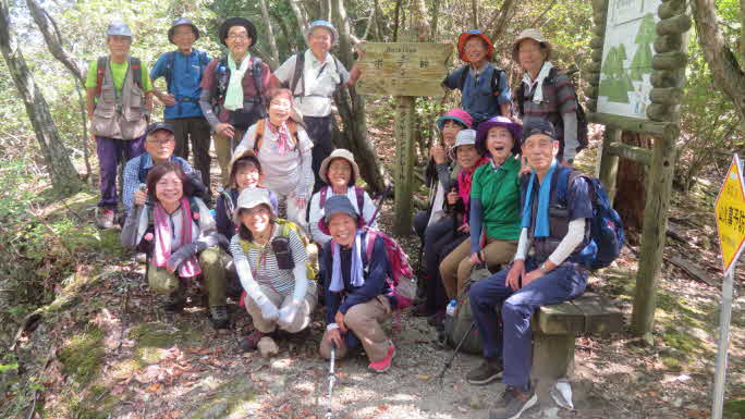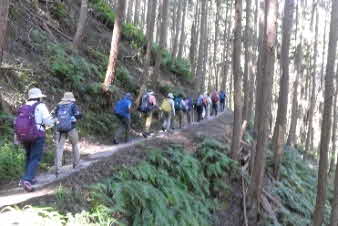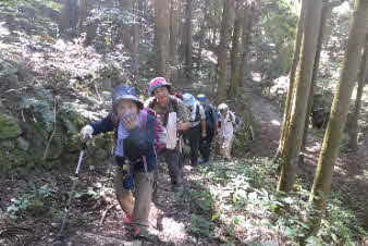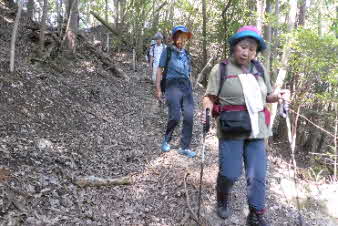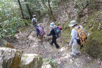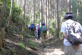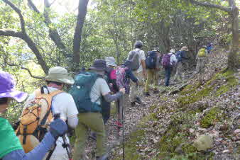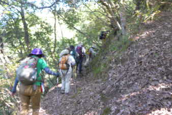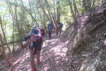 滝で立ち休憩して先に進む。登山道から周囲の山が見えてきた。岩湧山で山頂のカヤトが輝いて見えた。もうすぐカヤトの美しい時期だ。ボテ峠まで頑張って登っていく。 |