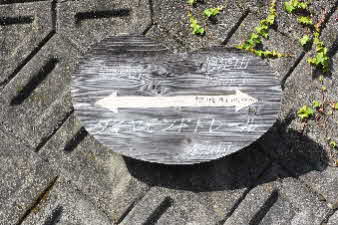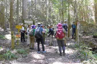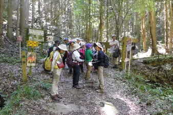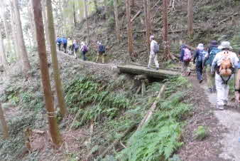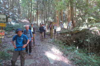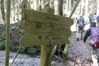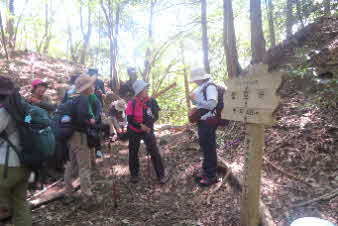 下り切ると、追分に着く。林道がここまで来ているがこの下に採石場があるようだ。登ってくる途中、岩の道があちこちに見られたが、硬い岩の山のようだ。倒木のあった土砂崩れをみると、土石の部分が薄く、大きな岩盤の山に薄皮の土に木々が植わっている感じだ。 |