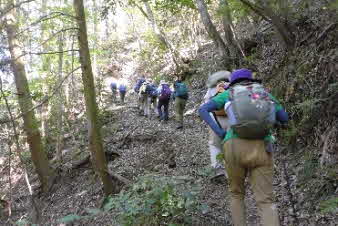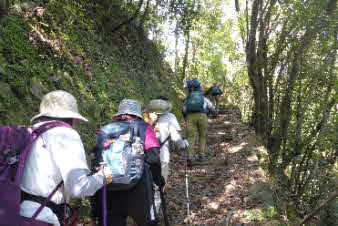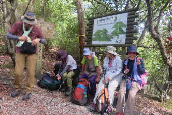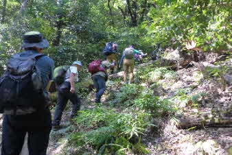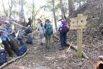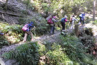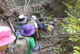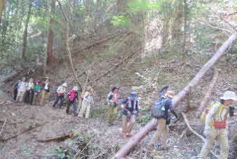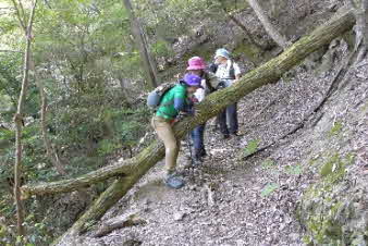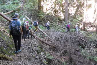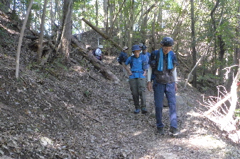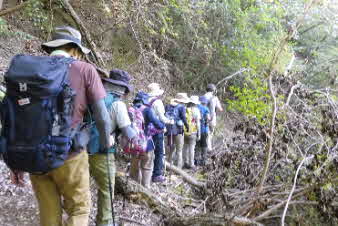 ボテ峠から少し下って登り返していくが、土砂崩れで倒木が行く手を塞いでいて、倒木を潜り抜けて前進する。登り返すと、番屋峠に到達する。ここでまた一休みして下っていくが、こちらにも倒木があり、馬乗りして越えて進んだ。 |
