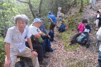 登り切ってボテ峠に到着、しばらく休憩だ。ボテ峠から左の尾根を登って行くと、猿子城山に続いている。猿子城山は、申年の干支の山に選んで登ったことがある。 |