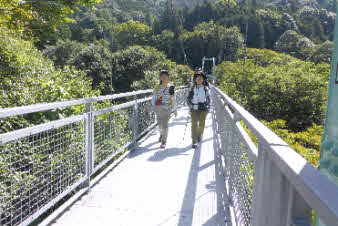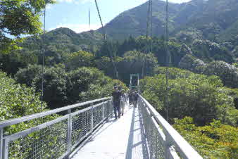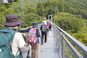 滝畑ダムBSに定刻より少し早く到着、支度をして出発だ。早速、吊橋の新侍橋を渡る。渡ると集落になり、辻にダイヤモンドトレイルの標識が出てくる。 |