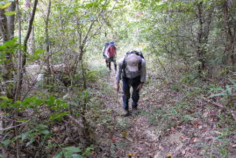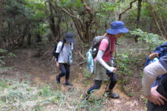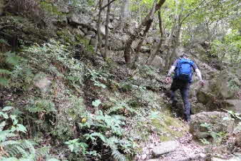 沢沿いに、蒸し暑いなか登っていく。この谷の道はいつまで続くのだろう。早く尾根に出たいと思いながら登っていく。大きな岩のゴロゴロ道を登り切ると、やっと尾根筋に出る。 |