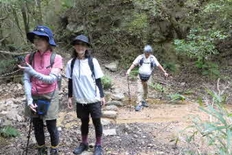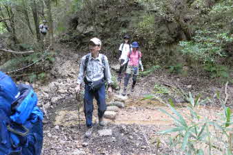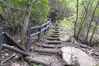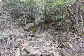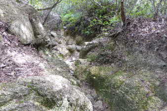 長く感じた急登は7、8分で、ここから少し下り、谷に出る。ほとんど水のない沢を渡り左岸に出る。ここから谷筋を登っていく。また急な登りになり、階段がついている。登り切ると、砂防ダムの上に出る。 |